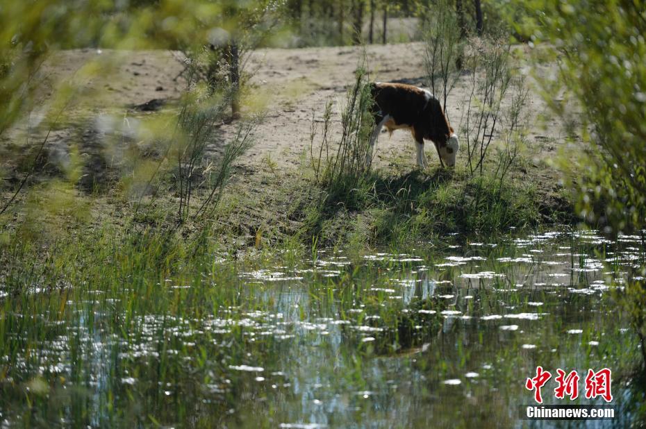 7月24日,牧民养殖的野牛在引自黄河凌水的池塘边吃草。据悉,中国第七大沙漠--库布齐沙漠所处的杭景旗境内,每年过境水量310亿立方米,当地一年三分一的时间都是凌汛期。政府因地制宜,2016年投资建成分凌引水渠、生态围堤等设施,自2016年至2018年黄河凌汛期以来,累计分凌5千余万立方米,形成约36平方公里保护湿地的面积,原来为沙漠的地貌逐渐变成绿洲,农牧民开始发展野牛养殖与农家乐旅游业。 中新社记者 刘文华 摄