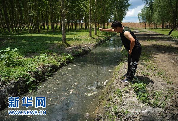 在吉林省长春市,黑臭水体专项督查组工作人员在一处向新凯河排水的水沟采样(6月28日摄)。 新华社记者 才扬 摄