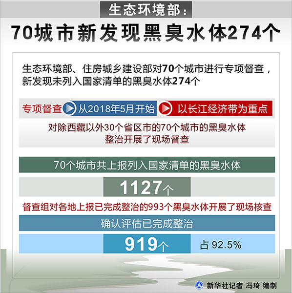 在生态环境部当天举行的新闻发布会上,张波说,专项督查从今年5月开始,以长江经济带为重点,对除西藏以外30个省区市的70个城市的黑臭水体整治开展了现场督查。70个城市共上报列入国家清单的黑臭水体1127个。督查组对各地上报已完成整治的993个黑臭水体开展了现场核查,确认评估已完成整治919个,占92.5%。但与此同时,督查还发现未列入清单的黑臭水体274个。“被督查城市黑臭水体完成比例统算起来比例就不高了。”