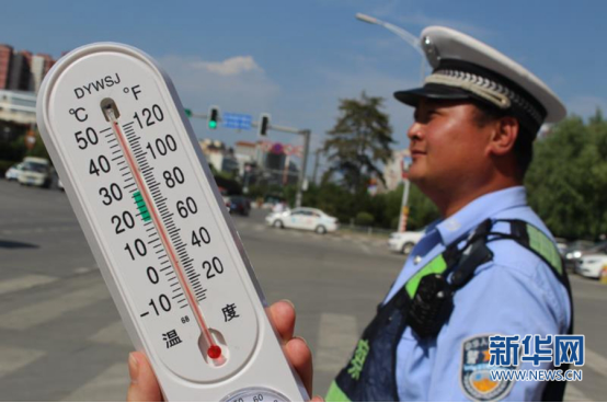图为延安宝塔区双拥大道东兴十字岗交警一大队执勤民警张泽正在执勤。当天天气预报温度37℃,实测室外地表温度超过温度计最大值50℃。