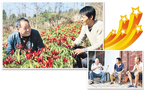 左上图 张东堂(左)在贫困户家的辣椒地里查看辣椒长势。 右下图 张东堂(左一)来到贫困户家中家访。 经济日报-中国经济网记者 郭静原摄