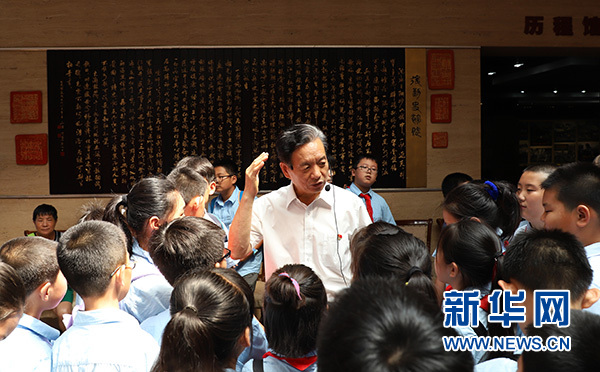 徐文涛为参观的小学生讲解党史军史(7月16日摄)。 新华社发(高磊摄)
