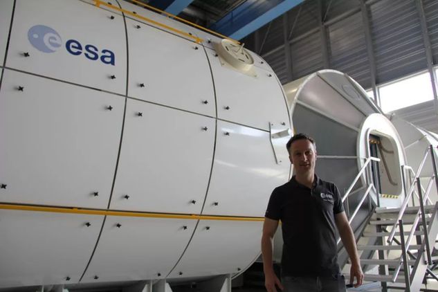 7月18日,德国宇航员马天站在欧航局国际空间站模拟舱外。(新华社记者张毅荣摄)