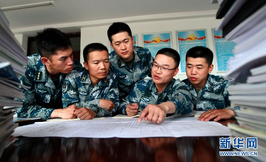 中部战区空军地导某部“高学历战勤班”成立于2009年。9年间,先后有3名博士、7名硕士在这里献身科技强军兴军。“高学历战勤班”现在的五位成员是硕士张少平(左二)、博士刘晓鹏(左三)、硕士何锋(左四)、硕士景晓龙(左五)、硕士李佳恒(左一)。刘川 摄 新华网 发