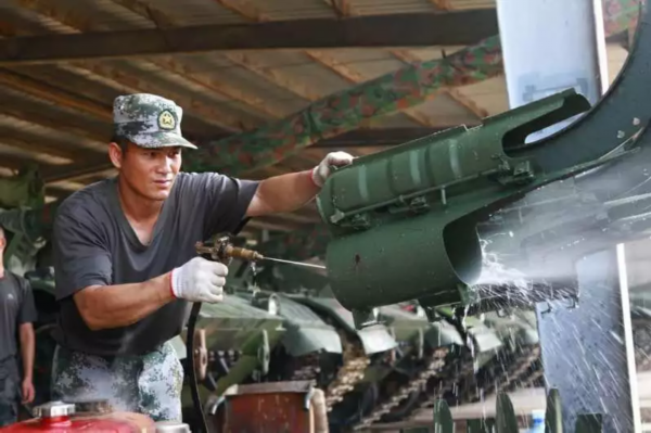 按照规定,训练完毕后,需对战车进行清理保养,小编也想上去帮帮忙,手接触到坦克钢铁盖时,一下子被烫的缩了回来。