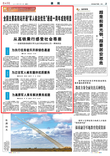 去年8月1日,中国铁路总公司、军委后勤保障部联合决定,在全国铁路系统开展军人出行依法优先工作。这项政策实施一年来成效如何?记者走进高铁站进行了采访调查,实地探访“军人依法优先”给官兵出行带来的新变化。请关注今天出版的《解放军报》的报道——