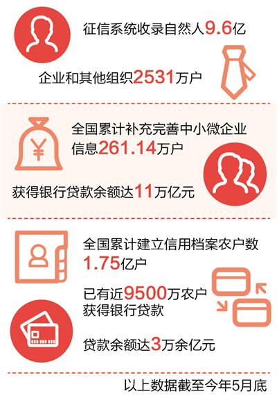 目前中国人民银行的征信系统已建设成为国内规模最大、收集信用信息最全、覆盖范围和使用最广的信用信息基础数据库。数据显示,截至今年5月底,征信系统收录自然人9.6亿,企业和其他组织2531万户。