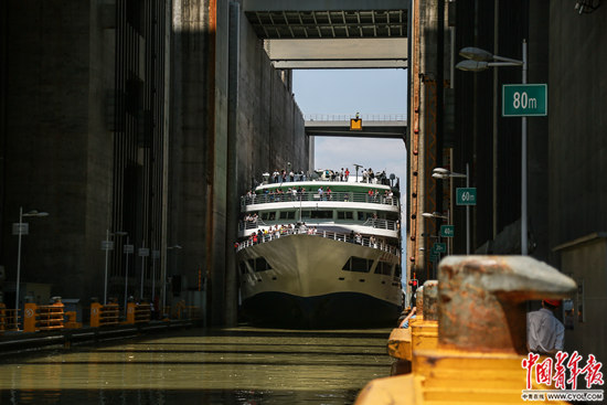 7月31日,湖北省宜昌市,船只准备进入三峡大坝升船机,进入厢体后这艘100多米长的客船将乘升船机下降80多米,“翻越”大坝。三峡升船机是世界上规模最大的升船机,也是三峡工程的收官之作。中国青年报·中青在线记者 赵迪/摄
