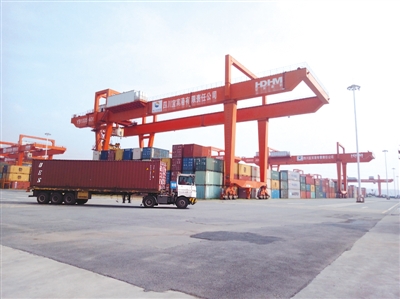 图为一辆货车正在宜宾港装运集装箱。本报记者 王俊岭摄