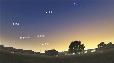 8月15日黄昏时分,西方天空中金星、月球、角宿一等的位置示意图。