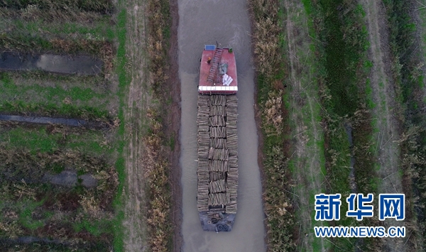 在位于湖南沅江市的南洞庭湖自然保护区核心区内,一艘货船将清理掉的欧美黑杨运出保护区(2017年11月27日摄)。新华社记者 李尕 摄