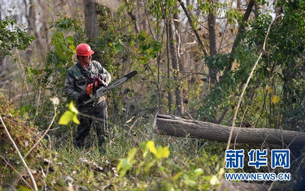 在位于湖南沅江市的南洞庭湖自然保护区核心区内,一名工作人员在清理欧美黑杨(2017年11月27日摄)。 新华社记者 李尕 摄