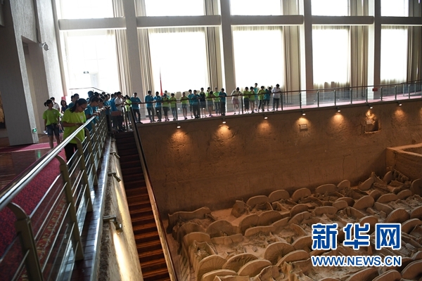 在位于曲沃县曲村镇的晋国博物馆,来自山西省临汾市的学生在参观车马坑遗址(7月31日摄)。 新华社记者 杨晨光 摄