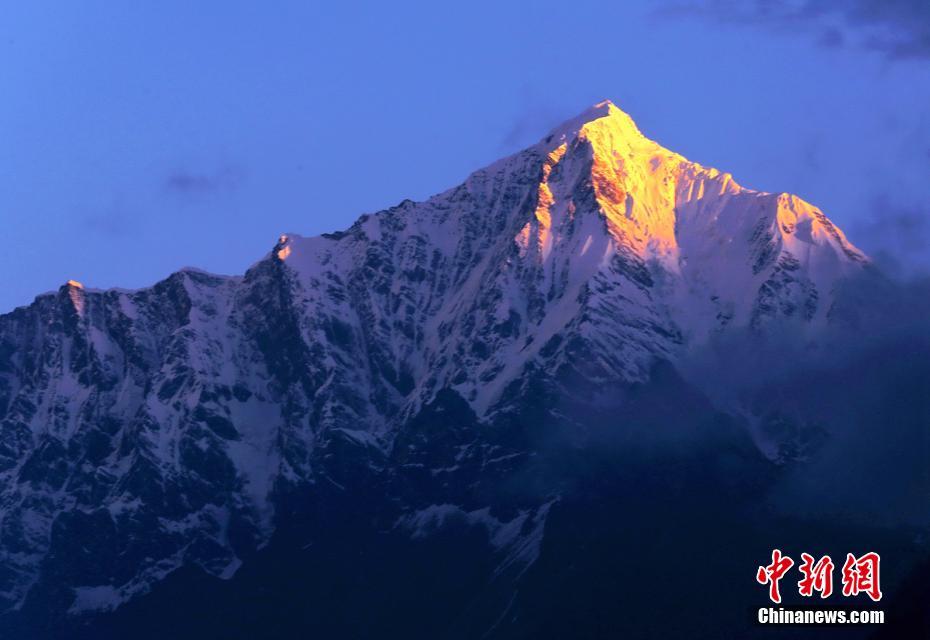 吉隆沟给人最大的感受是惊讶于造物的神奇,让四季并存在这狭小的山谷间。峡谷绿树成荫,恬静的村庄被绿树环抱着,不远处能清楚地看见若隐若现的雪山。图为日照金山——日吾班巴雪山。 杨建 摄