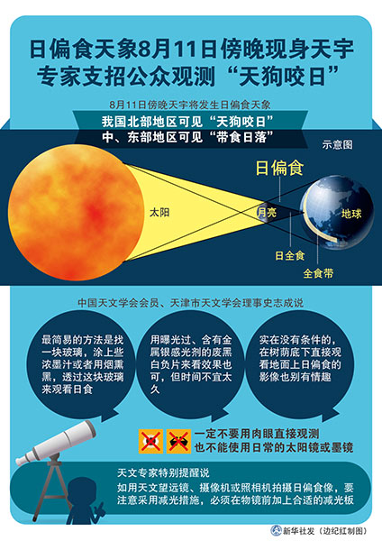 新华社天津8月7日电(记者周润健)本月11日傍晚天宇将发生日偏食天象,这是今年的第三次,也是我国能观测到的唯一一次日食。其中,我国北部地区可见“天狗咬日”,中、东部地区可见“带食日落”。究竟如何更好地观测和拍摄此次日偏食,天文专家在此为公众支招。