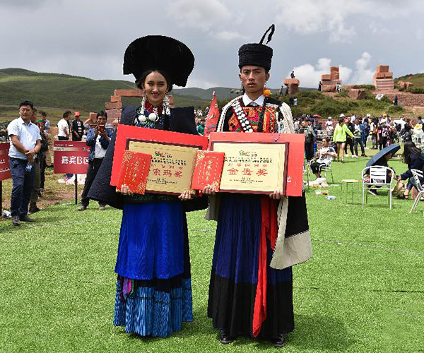 这是8月6日拍摄的获得“金索玛”奖项的冷恩阿媛(左)和获得“金鹰”奖项的吉克罗曲。 当日,2018年凉山彝族火把节彝族传统选美大赛在四川省凉山彝族自治州昭觉县谷克德的草原上举行。来自四川、云南、贵州等地的45名彝族青年男女,通过服装展示、才艺表演、组合表演、知识问答等环节,由德高望重的长者评选出美丽的“金索玛”和威武的“金鹰”。
