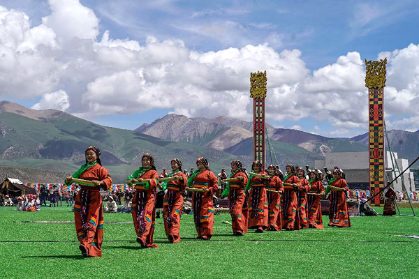 8月8日,参加表演的牧民在开幕式上表演舞蹈。 藏族谚语有云:“赛马要在平坦的草原上,英雄要在烈马的脊背上。”8月8日,已有300多年历史的当吉仁赛马会在西藏自治区拉萨市当雄县拉开帷幕。 当雄县位于拉萨市北部,平均海拔4300米,是拉萨通往藏北牧区的“北大门”。公元17世纪,蒙古和硕特部落首领固始汗率部入藏,选中拉萨西北部的草原牧养军马,进行军事训练。这片草原位于念青唐古拉山南麓,平坦宽阔,水草丰美,故被命名为“当雄”,意为“精心挑选的牧场”。蒙古骑兵规定每年举行一次检阅式,这便是赛马大会的缘起。