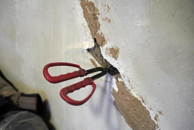火钳在裂缝中可以轻易捅出墙外。