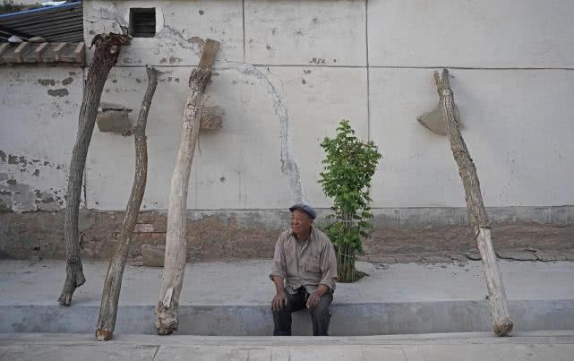在安定区新集乡田坪村中川社中湾社的扶贫新村,不少房屋的围墙开裂严重,有的房屋整间垮塌。房屋的墙体被村民们用吊着磨盘的树干勉强支撑,防止轰然倾塌。