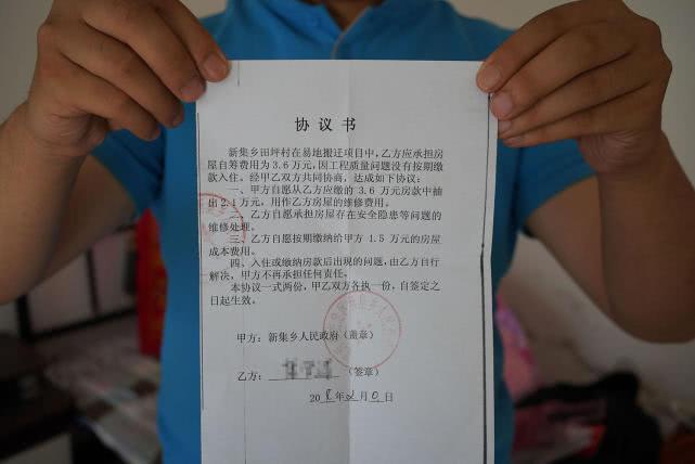 康学清出示的一份由新集乡政府发出的协议书显示:新集乡田坪村在易地搬迁项目中,乙方(农户)应承担房屋自筹费用为3.6万,因工程质量问题没有按期缴款入住,经协商,甲方(乡政府)自愿从乙方应缴的3.6万元房款中抽出2.1万,用作乙方房屋的维修费用。乙方自愿承担房屋存在安全隐患等问题的维修处理。入住后出现的问题,由乙方自行解决,甲方不再承担任何责任。