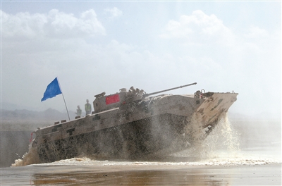 “苏沃洛夫突击”步战车组项目比赛中,中国参赛队战车穿越涉水场。袁 凯摄