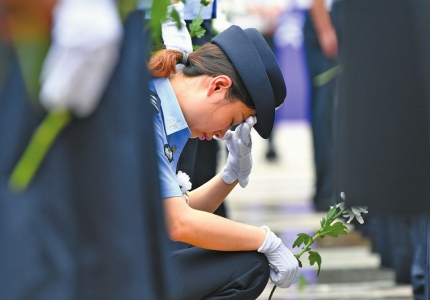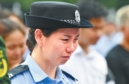 当公安部治安管理局副局长李剑涛宣读公安部唁电,四川省公安厅党委委员、政治部主任舒文宣读省公安厅唁电时,台下不少人已忍不住啜泣。因为情绪激动,多位民警蹲下身去,平复心情。