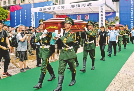 8月10日,王涛、廖弦同志遗体送别仪式在仁寿县法治广场举行,武警官兵为王涛、廖弦抬棺,送他们最后一程。