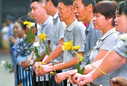 上午8点,在通往广场的沿路,身着素衣、手持白花来送英雄最后一程的市民已经排起数公里的长龙。当天,到现场悼念送别两位英雄的市民达到十万人。
