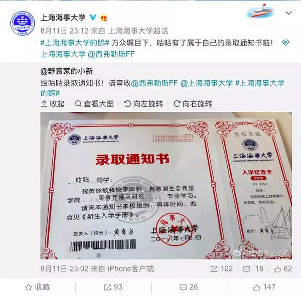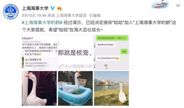 经过请示,上海海事大学回复称,决定接收这只名叫“咕咕”的鹅加入“上海海事大学的鹅”这个大家庭。