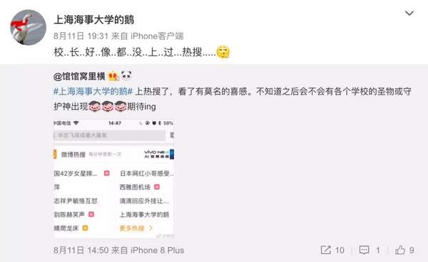 11日,“上海海事大学的鹅”还在微博上骄傲地说,校长好像都没有上过热搜,我们已经上了,还配了一张“上海海事大学的鹅”登热搜的截图。