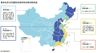 基本公共卫生服务支出责任实行中央分档分担办法:第一档包括内蒙古、广西、重庆等12个省(自治区、直辖市),中央分担80%;第二档包括河北、山西等10个省,中央分担60%;第三档包括辽宁、福建、山东3个省,中央分担50%;第四档包括天津、江苏等,中央分担30%;第五档包括北京、上海2个直辖市,中央分担10%。