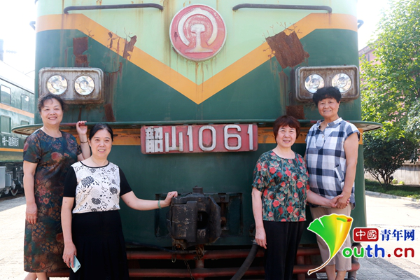 2018年,中国第一代电力机车女司机白燕娥、杨宪美、胡学政、侯爱华(从左至右)在曾经驾驶过的机车前留影。中国青年网见习记者 李慧慧 摄