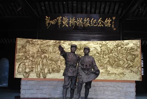 △黄桥战役纪念馆的一幅铜质浮雕上,右侧是新四军指战员在前线奋勇杀敌的景象;左侧则是黄桥老区人民扛着粮食,推着装满烧饼的小车奋勇支前的场面