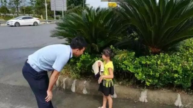 公路上车来车往,5岁的小女孩独自行走在路边。8月13日一大早,温州市永嘉县枫林派出所的民警戴柏清就遇到了这样的一幕。