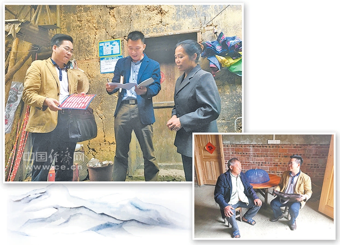左上图:蓝标河生前(左一)入户开展扶贫工作。 右下图:蓝标河生前(右)在融安县大坡乡同仕村和贫困户交流脱贫经验。经济日报-中国经济网记者 童政摄
