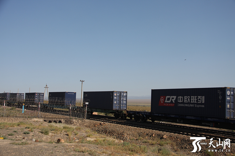 8月16日上午11时许,在阿拉山口铁路口岸站,一辆中欧班列一路西行、疾驰而去,即将开往欧洲。