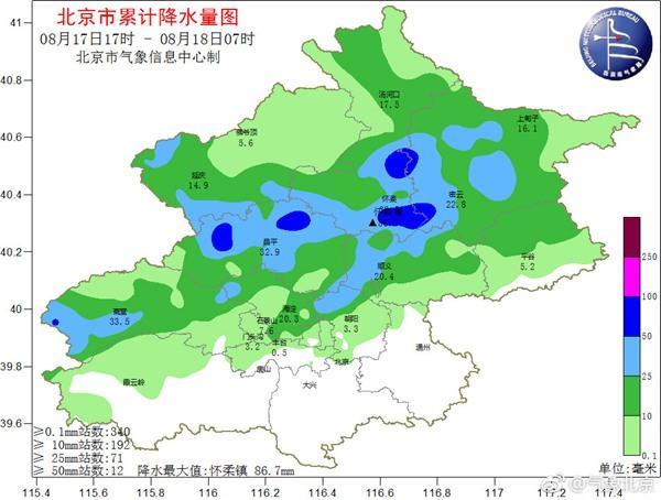 北京市气象台发布17日17时至18日07时降水量,全市平均12.5毫米,城区平均7.2毫米,西北20.1毫米,东北19.8毫米,西南9毫米,东南微量,最大怀柔怀柔镇86.7毫米。