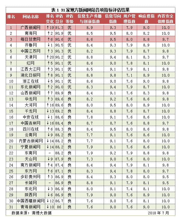 地方新闻网站媒介技术运用更趋多元化。31家地方新闻网站评估总分均值为88.9,上升0.8%,总体表现良好。信息生产传播与创新指数与用户管理指数环比分别上升6.3%、0.2%,其中有11家网站生态表现为优,20家表现良好。网站排名波动较大,广西新闻网、天津网排名上升较快,得益于积极运用H5、短视频、直播、VR、漫画图解等呈现新形式,弘扬主旋律,宣传正能量。