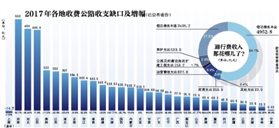 昨日(24日)上午,交通运输部召开例行发布会,发布了《2017年全国收费公路统计公报》(以下简称《公报》),截至2017年底,全国收费公路债务余额52843.5亿元,通行费收支缺口达4026.5亿元,收费公路超八成的收入用于偿还债务本金及利息。