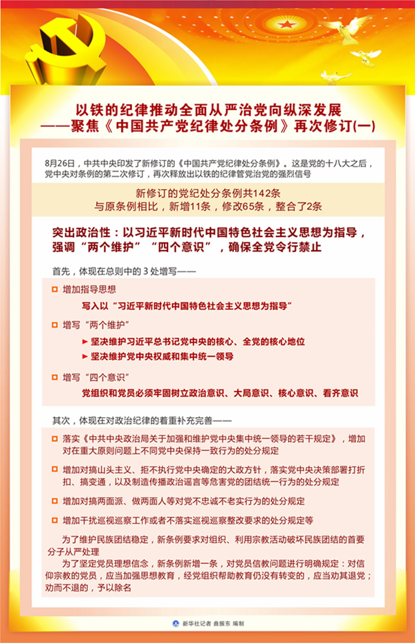 26日,中共中央印发了新修订的《中国共产党纪律处分条例》。这是党的十八大之后,党中央对条例的第二次修订,再次释放出以铁的纪律管党治党的强烈信号。