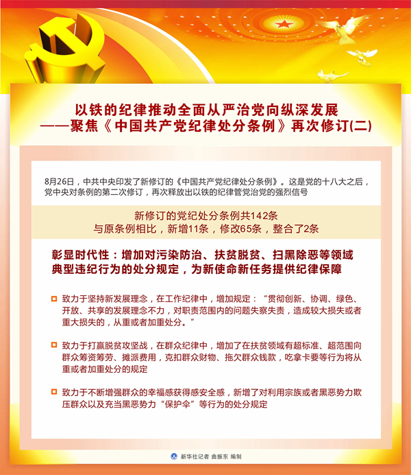 新华社北京8月27日电 题:以铁的纪律推动全面从严治党向纵深发展——聚焦《中国共产党纪律处分条例》再次修订