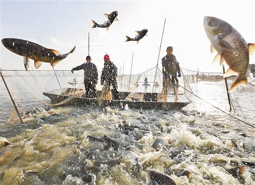 江苏省盱眙县河桥镇渔民在捕鱼。盱眙县不断探寻水产养殖业高质量发展之路,不断提升当地群众生活水平。 周海军 摄