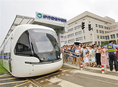 湖北省武汉市省中医院门口,乘客在等待有轨电车。近年来,当地把地铁、有轨电车、公交车和出租车站点安排在离医院近的地方,让百姓方便就医。郑传海 摄