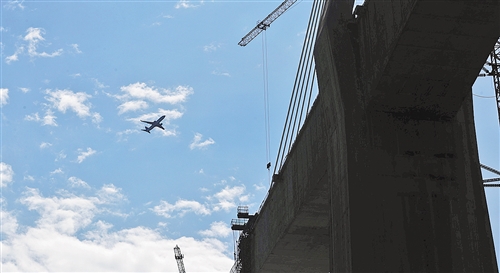 重庆市黔江区境内在建的黔张常铁路阿蓬江特大桥。近年来,黔江区加大立体交通建设,有力推动了当地经济发展。 杨敏 摄