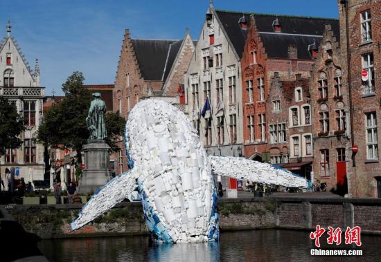 资料图:当地时间7月2日,来自纽约布鲁克林的建筑设计公司StudioKCA用从海洋中打捞起来的5吨塑料垃圾,打造了一个38英尺(约11.6米)高的巨型鲸鱼“摩天大楼”(Skyscraper)。提醒人们关注塑料污染。
