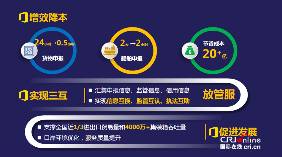 国际贸易单一窗口的运营,为贸易船舶进出上海港大大节约了时间和成本。办通关手续实现了从“人跑路”向“信息跑路”的转变,提交的资料由四套系统1113项数据简化为一套系统388个数据,船舶进出港环节全流程从原来的2天缩短至2小时,货物进出口申报环节全流程从24小时缩短至半个小时。