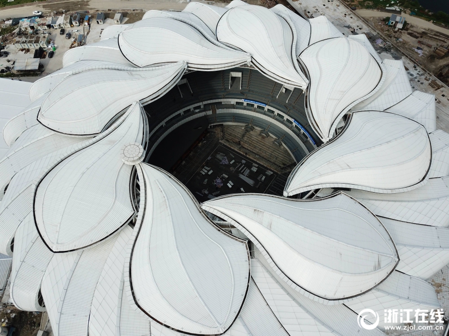 8月28日,距离12月3日在杭州举办的“第14届国际泳联世界短池游泳锦标赛”还有104天。作为本次国际大赛的主场馆,正在建设中的杭州奥体网球中心(小莲花)也已进入室内装修、设备安装及馆外配套设施等项目的施工冲刺阶段,按计划将在9月底完工,交付验收和调试运行。(浙江在线记者 董旭明 摄)