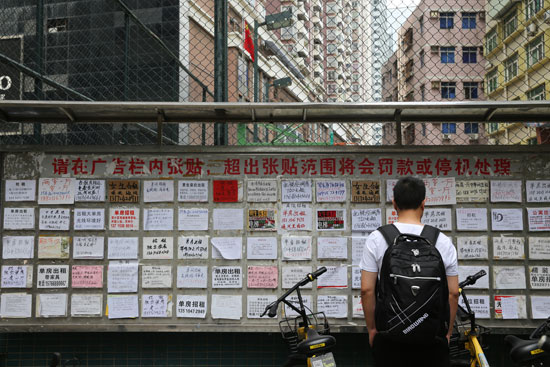 深圳市福田区岗厦村中的公告栏上贴满了各种招租求租信息,一层层覆盖着,图为一位白领模样的年轻人在看租房信息,岗厦村里像他这样的白领还有很多,他们大都在附近的写字楼里上班。这个位于深圳市中心的城中村房东靠房租可以月入10万元,白领花千元只能租个床位。视觉中国供图