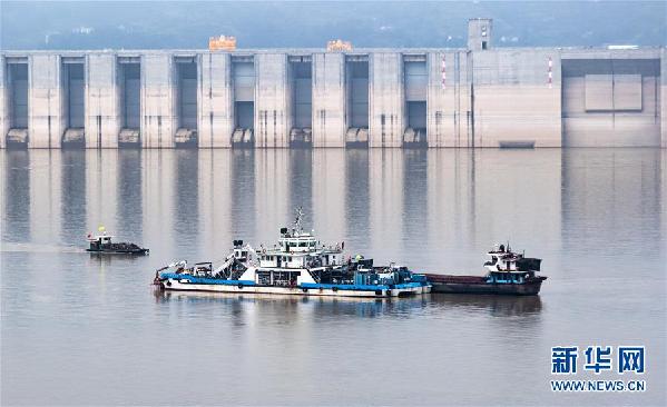 9月2日,清漂船舶在三峡大坝前清理水上漂浮物,为新一轮蓄水做准备。新华社发(郑家裕 摄)