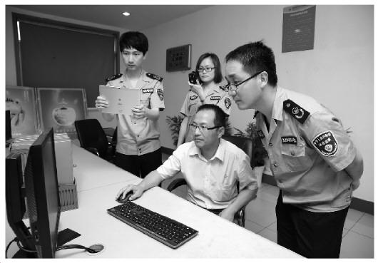 图为环境监察执法人员现场查看企业污染防治设施运行情况。